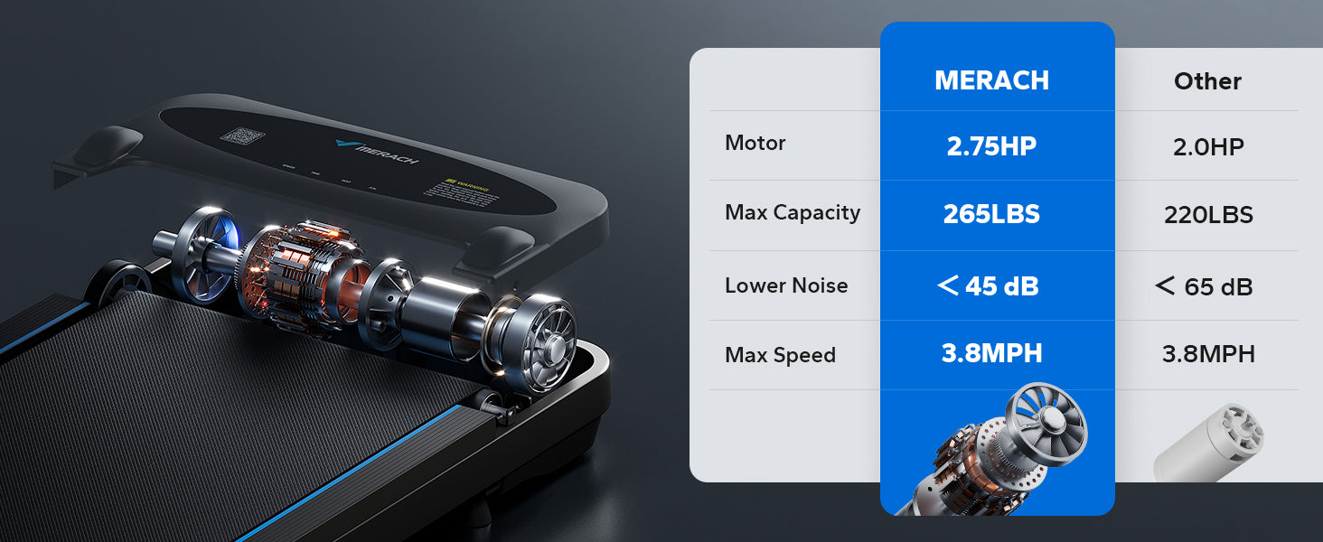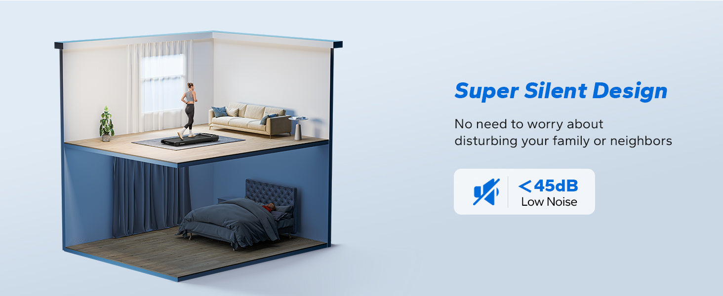 A near-silent 2.75HP motor operates at under 40dB, supporting speeds from 1–6.1 km/h and users up to 120kg. The noise-reducing design makes it suitable for apartments, shared spaces, and work calls.